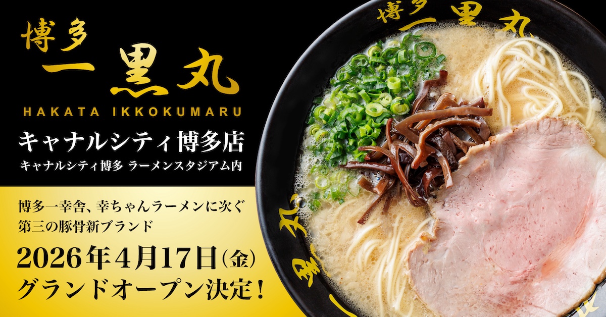 2026年4月17日、福岡市博多区のキャナルシティ博多内「ラーメンスタジアム」に、伝説のブランド「博多一黒丸」がグランドオープンします。博多一幸舎の創業者・吉村幸助氏がかつて店長を務め、白濁豚骨が主流の博多で豚骨醤油という新たなジャンルに挑んだ幻の味が、25年の時を経て始まりの地で復活を遂げます。