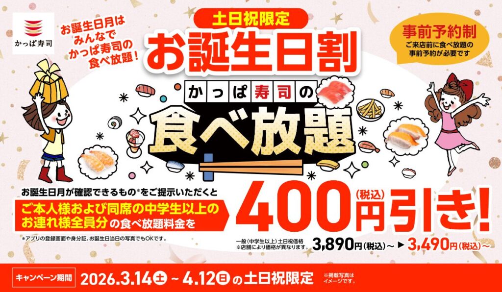 かっぱ寿司にて、誰かの特別な日をグループ全員でお得に楽しめるキャンペーン「お誕生日割」が、2026年3月14日よりスタートします。お誕生日月の方が1人でもいれば、同席する中学生以上の方全員の食べ放題料金が、土日祝価格より400円引きになるという太っ腹な企画です。